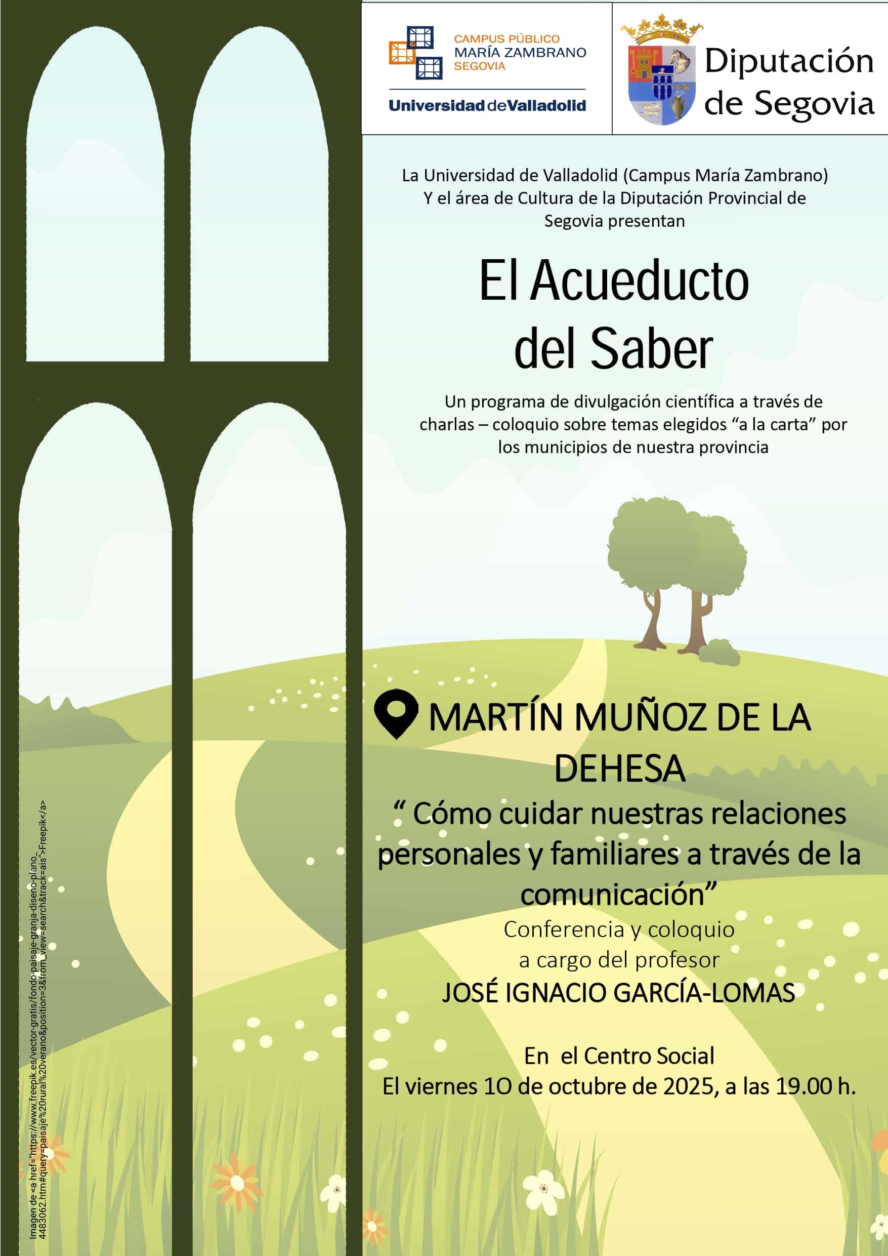 El Acueducto del Saber continúa su recorrido por la provincia con una nueva parada en la localidad de Martín Muñoz de la Dehesa. El profesor de la Facultad de CC.SS., Jurídicas y de la Comunicación y coordinador de este programa, José Ignacio García-Lomas Taboada, ofrecerá una conferencia titulada “Cómo cuidar nuestras relaciones personales y familiares a través de la comunicación”.
