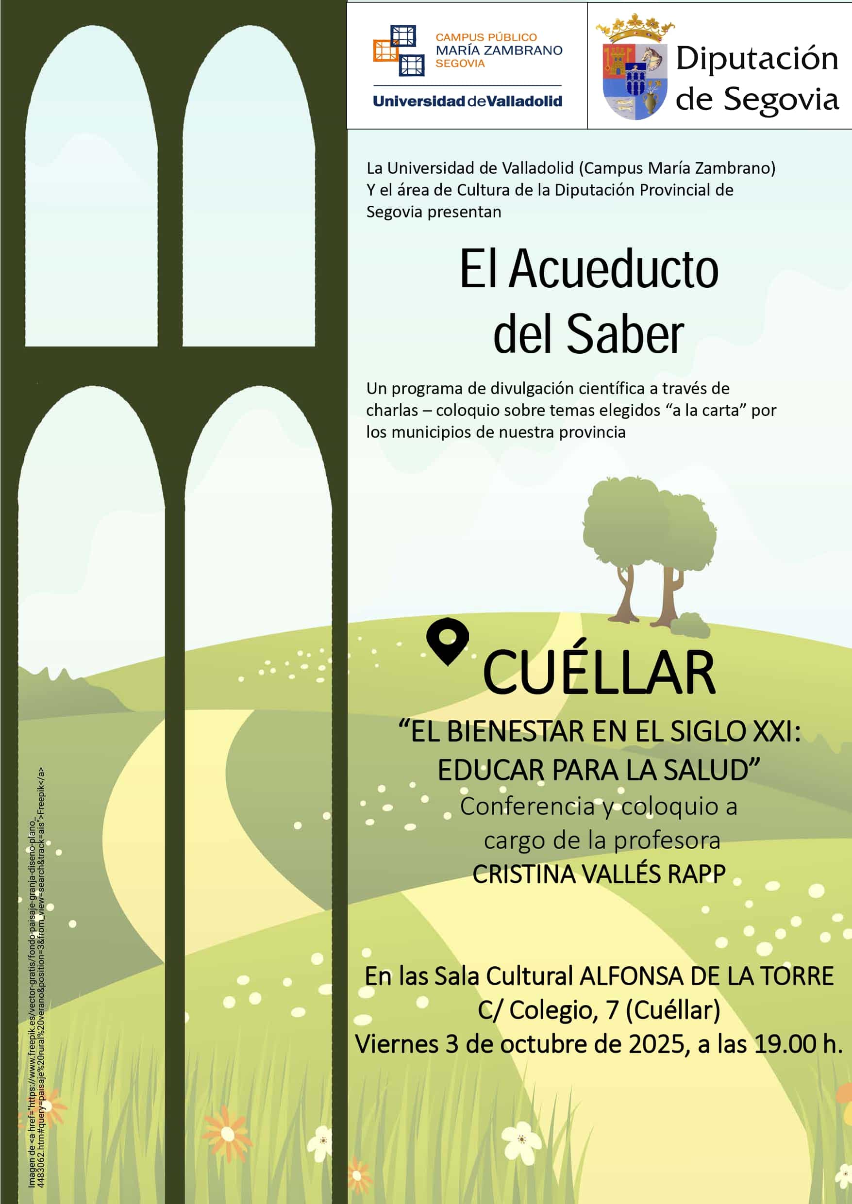 El Acueducto del Saber continúa recorriendo la provincia y este próximo fin de semana llegará hasta Cuéllar. La profesora Cristina Vallés, de la Facultad de Educación de Segovia, ofrecerá una conferencia bajo el título El bienestar en el siglo XXI: Educar para la salud. La cita será el viernes 3 de octubre a las 19h de la tarde en la Sala Alfonsa de la Torre de Cuéllar.